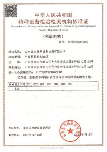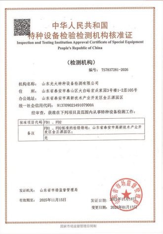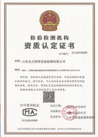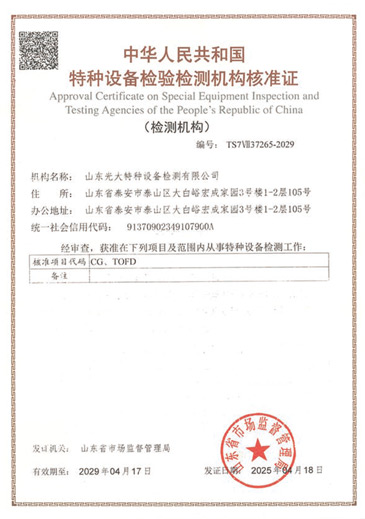 山東光大特種設(shè)備檢測有限公司是經(jīng)山東省市場監(jiān)督管理局核準的甲類B1特種設(shè)備綜合檢驗機構(gòu)。2017年9月30日取得了山東省市場監(jiān)督管理局頒發(fā)的《檢驗檢測機構(gòu)資質(zhì)認定證書》。2018年2月22日取得了山東省市場監(jiān)督管理局頒發(fā)的《特種設(shè)備檢驗檢測機構(gòu)核準證》(起重機械)檢驗檢測資質(zhì)。2021年11月取得山東省市場監(jiān)督管理局版發(fā)的《特種設(shè)備檢驗檢測機構(gòu)核準證》(安全閥在線、離線)校驗資質(zhì)。2023年11月取得山東省市場監(jiān)督管理局頒發(fā)的甲類檢驗機構(gòu)B1《特種設(shè)備檢驗檢測機構(gòu)核準證》,具有壓力容器(RD2...